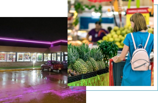 Transform your grocery store or supermarket's building into one of your most powerful marketing elements. Cut through the visual clutter and create vibrant, on-brand lighting experiences that attract more customers to your store.